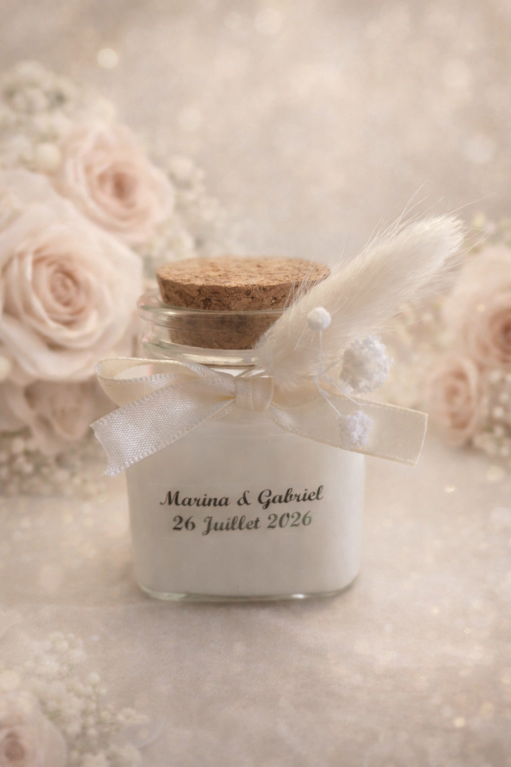 Cette bougie artisanale personnalisée avec vos prénoms et la date de votre mariage est le cadeau parfait pour remercier vos proches avec élégance.