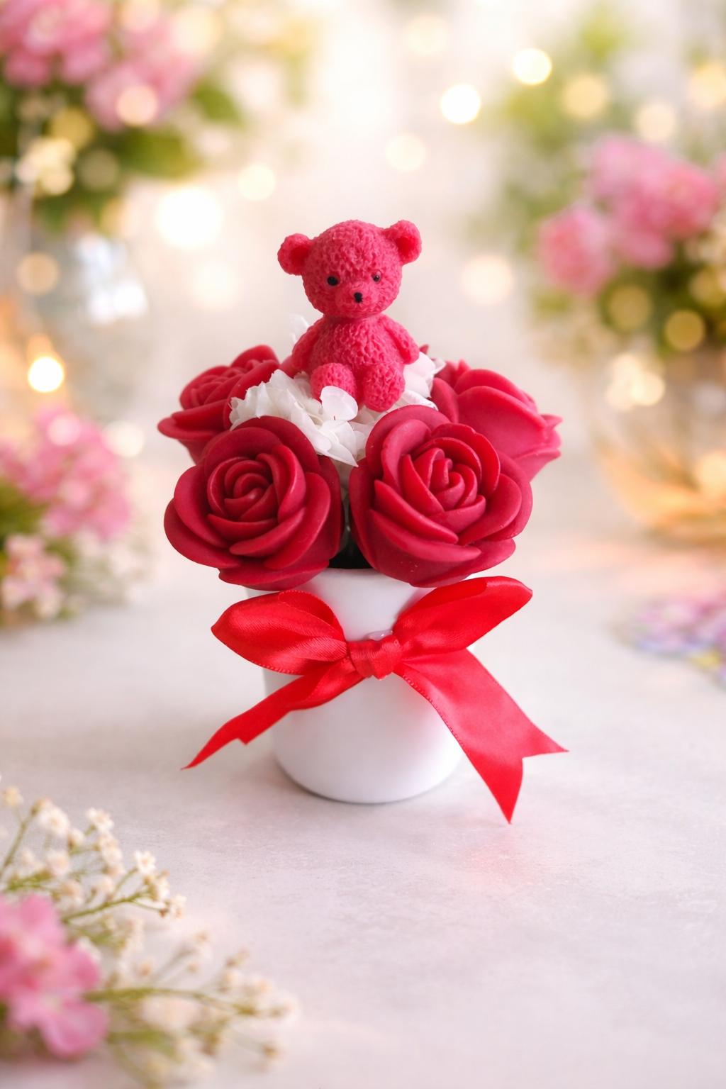 Craquez pour ce bouquet parfumé décoratif composé de fleurs délicatement sculptées et d’un adorable ourson, idéal pour un cadeau de naissance, baptême, anniversaire ou baby shower.